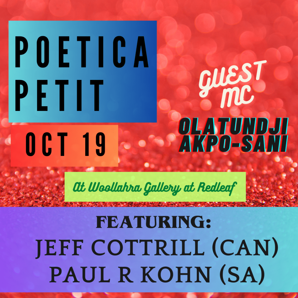 Hello poets and poetry lovers. October is upon us which means the days are longer and the nights are brighter and the verandah awaits our gorgeous presence. Join us October 19 for a night of words at Woollahra Gallery at Redleaf downstairs in the Cultural Hub. This month our features are both visiting poets from afar. Poet and comedian Jeff Cottrill (Canada) and poet and songwriter Paul R Kohn (South Australia) are on their Decent Beings national tour and Poetica is so pleased to have them on our dance-card. See their bios below. Also this month, with Miriam on foreign shores, your MC for the night is the marvellous Olatundji Akpo-Sani. The open mic is as per usual. Show up and throw your name in the hat. Wine, kombucha and cheese. Gonna be another night of all that feels right in the world.