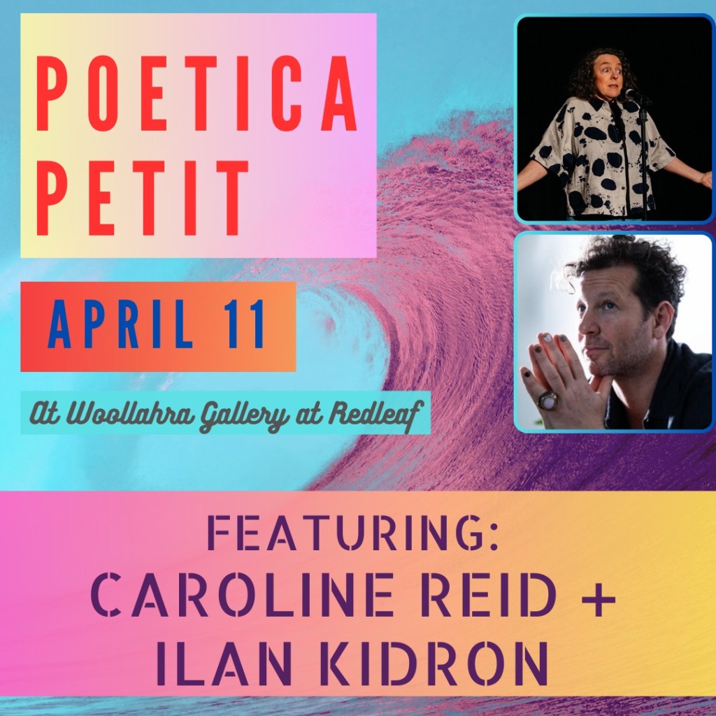 The interstate guests continue to keep flying in to join us at Poetica Petit. On April 11 we are thrilled to welcome award-winning poet and performer Caroline Reid from Adelaide. Plus Poetica favourite Ilan Kidron returns for a musical set to set the night in motion. Of course there’s the open mic and I’ll try to surprise you with something delicious to nosh on.