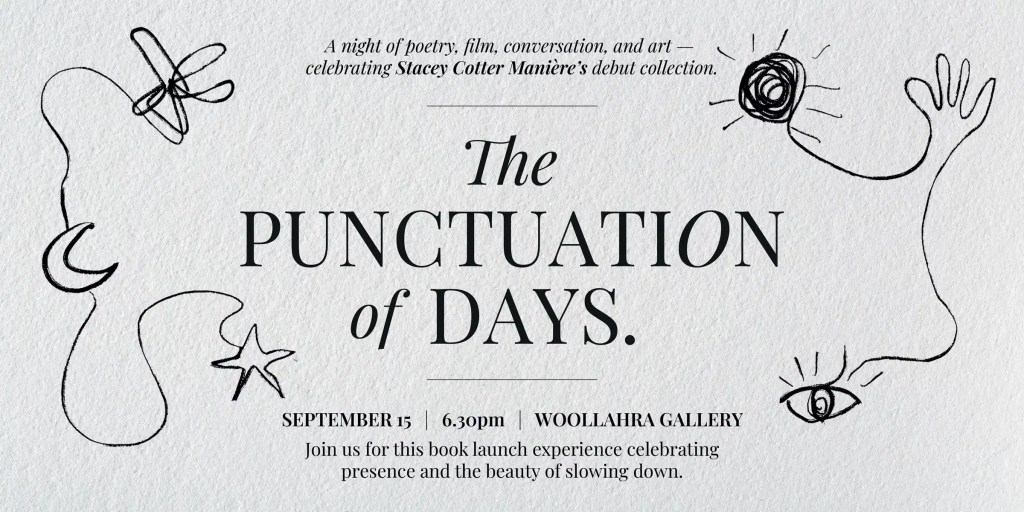 The Punctuation of Days – A Night of Poetry, Film & Conversation is a book launch celebrating Stacey Cotter Manière’s debut collection. Immerse yourself in an evening of presence, creativity, and the beauty of slowing down — held in the elegant Woollahra Gallery at Redleaf.