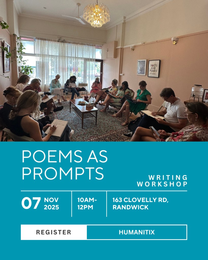 And November events are all up for the taking. November 7 is Poems as Prompts as per usual. There will be cake for a certain someone’s big birthday too. https://events.humanitix.com/poems-as-prompts-writing-workshop-11