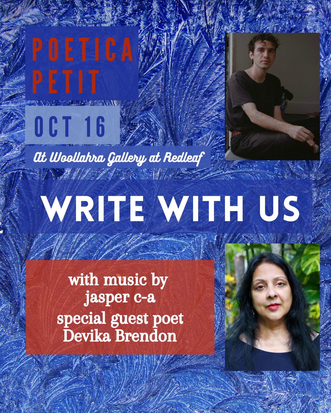 It was going to be a quieter month and now it’s not! Starting with Poetica Petit on Oct 16 – to coincide with Woollahra Gallery’s Sculpture Prize – we are going to be upstairs in the gallery listening to musician jasper c-a with the prompts of the artwork to encourage us to write. You will have a chance to see all the sculptures at sunset. Then we have a very special feature set with poet, writer, editor, academic and reviewer – Devika Brendon who is visiting for a short time from Sri Lanka. then the open mic awaits your words. And of course there’s wine, kombucha and cheese! https://www.eventbrite.com.au/e/poetica-petit-poetry-night-tickets-1112224456289