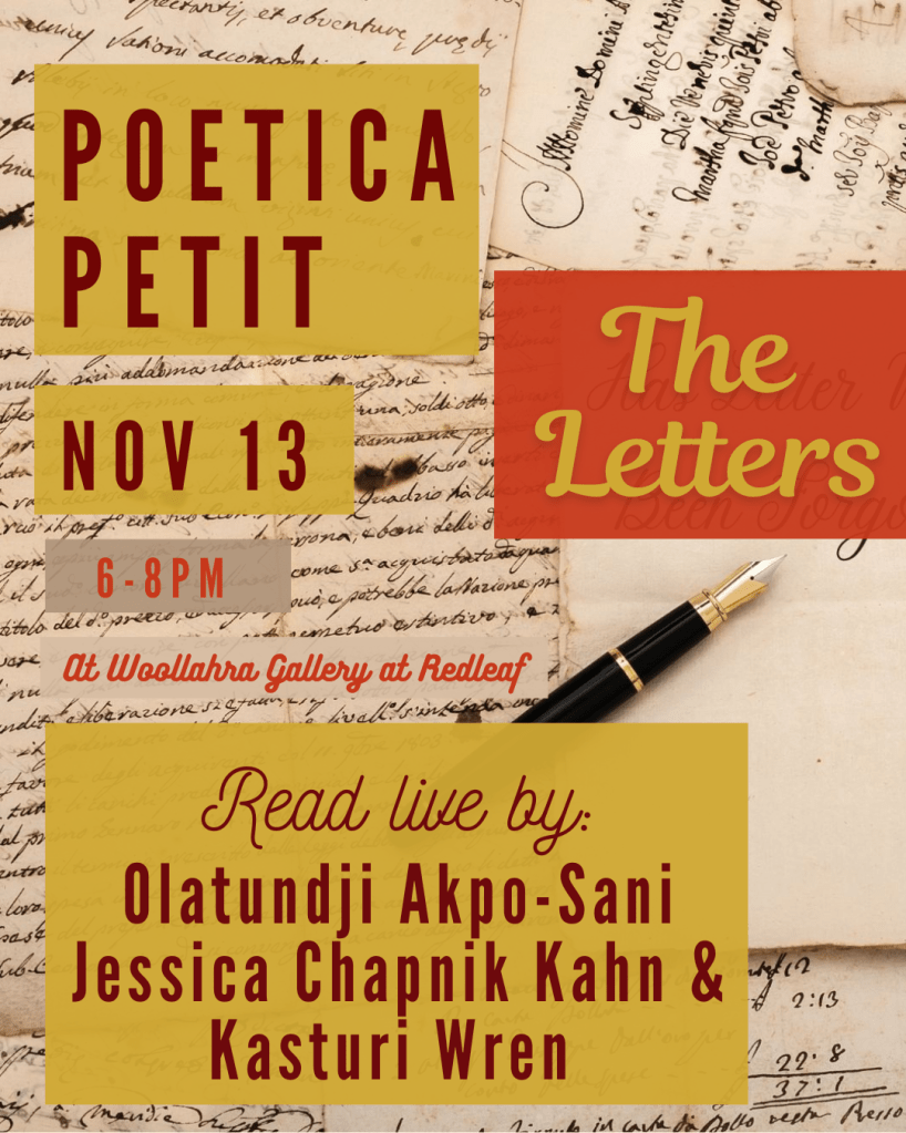 Then on November 13 we have a very special Poetica Petit – The Letters. A night of letters between some much loved poets – from Bukowski to Dickinson, Woolf to Lorde, we have some gorgeous readers to deliver the letters. Welcoming back Olatundji Akpo-Sani, Jessica Chapnik Kahn and Kasturi Wren. The open mic is also an invitation to read us your letter to a poet, a friend, a lover. It is a night of letters and we want to hear yours. https://www.eventbrite.com.au/e/poetica-petit-poetry-night-tickets-1112224456289