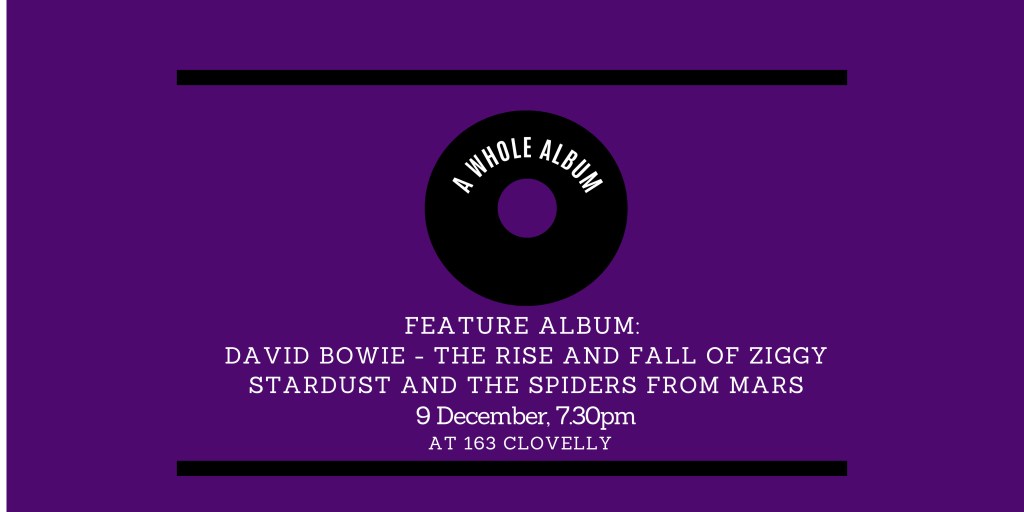 DEC 9 – A WHOLE ALBUM – Guy is going out with a banger – DAVID BOWIE – Ziggy Stardust. Come and listen to it in its entirety. No interruptions. Best sound. https://events.humanitix.com/a-whole-album-dec-9-david-bowie-the-rise-and-fall-of-ziggy-stardust-and-the-spiders-from-mars