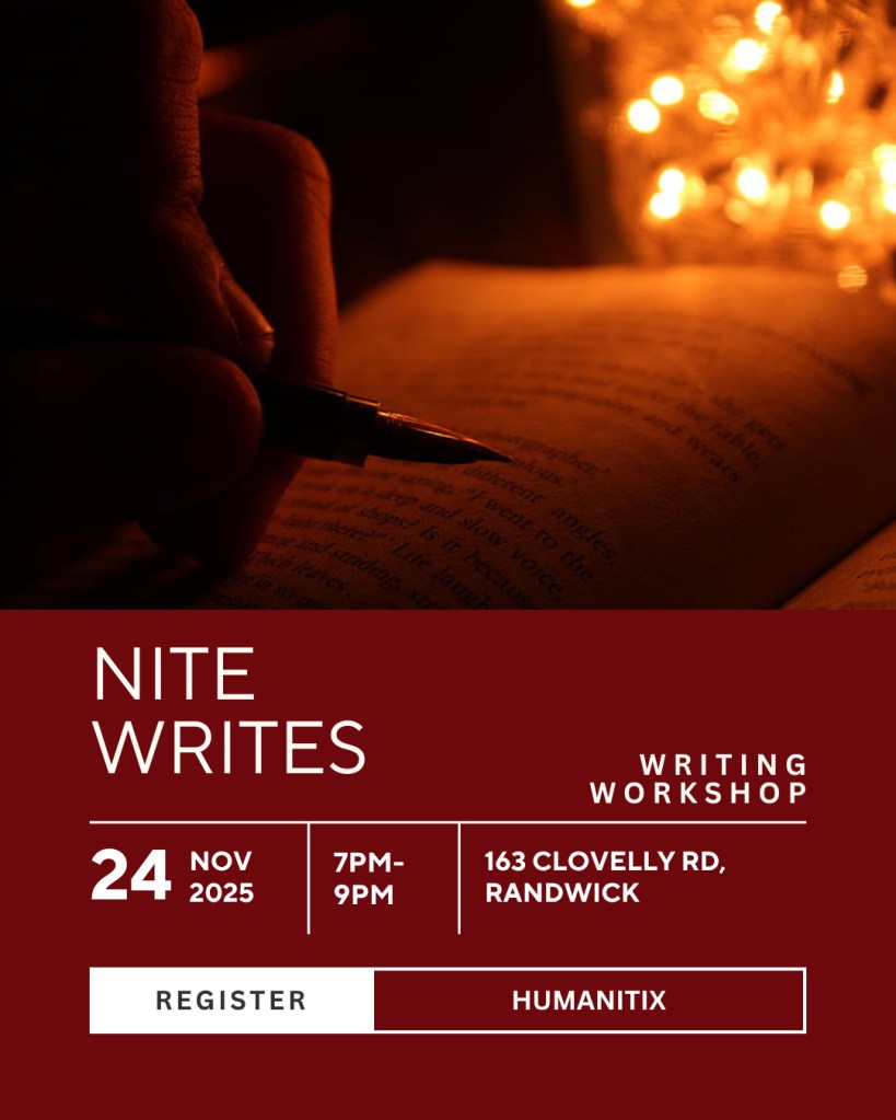 NOV 24 – NITE WRITES – writing workshop. All forms of writing welcome. Prompts to help. https://events.humanitix.com/nite-writes