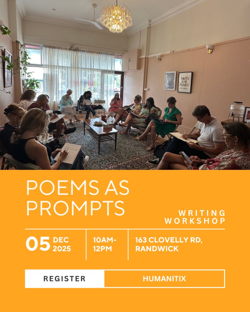 DEC 5 – POEMS AS PROMPTS – writing workshop where we use poems as prompts to write our own. https://events.humanitix.com/poems-as-prompts-writing-workshop-12-eyzxe8zj