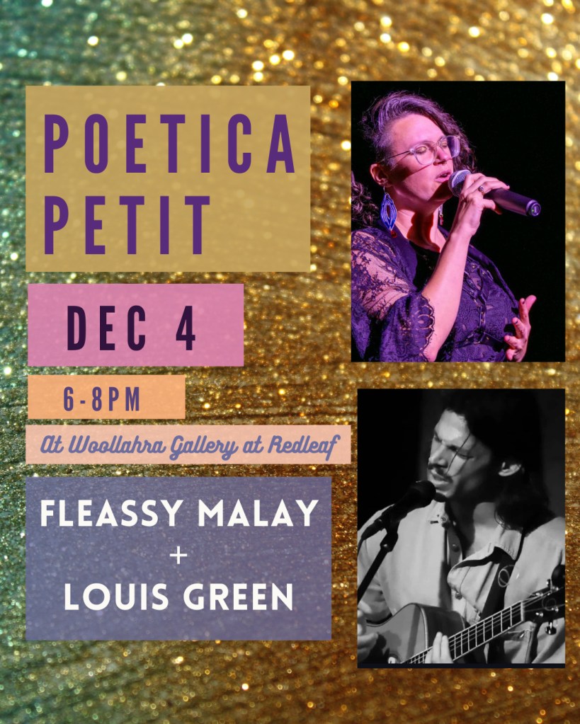 DEC 4 – POETICA PETIT – featuring Fleassy Malay + Louis Green. Plus OPEN MIC, wine, kombucha and a little bit extra to close the year. https://www.eventbrite.com.au/e/poetica-petit-poetry-night-tickets-1112224456289