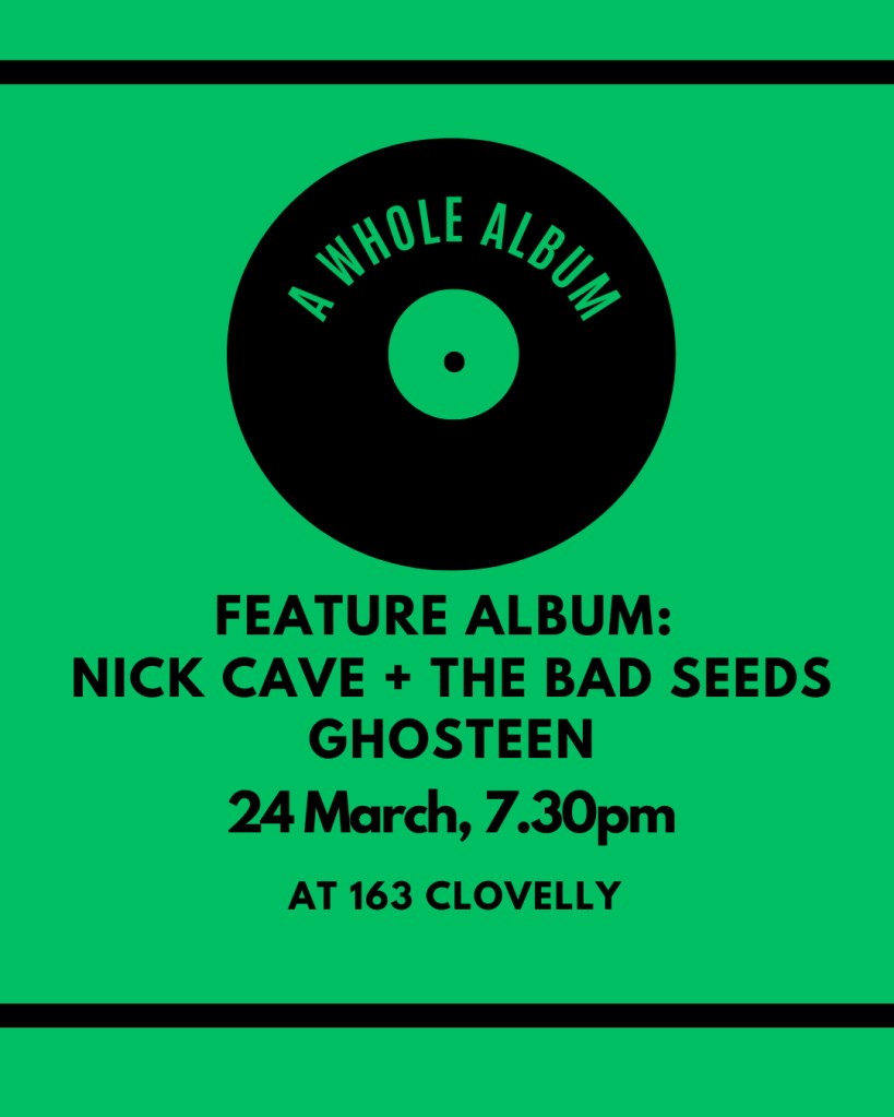 Poetica continues on her merry way. We have three more offerings til we move into April. First up – the incomparable Nick Cave and the Bad Seeds finally get their hour of deep listening at A Whole Album with Guy on March 24. The chosen album is Ghosteen – and if you don’t know it here is an opportunity to dive in. And if you do know it, here is an opportunity to dive in deeper. Bookings essential and limited spots. https://events.humanitix.com/a-whole-album-march-24-nick-cave-the-bad-seeds-ghosteen