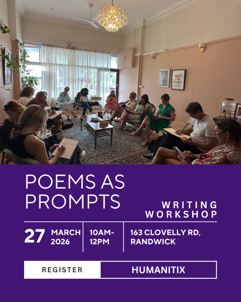 Next up it’s back to back writing workshops with Miriam – Poems as Prompts on March 27 and Nite Writes on March 31. Different times of day bring different writings. You’re welcome to attend both. Nite Writes is not just poetry – it’s an opportunity to explore other writing styles. Booking for each one is here: https://events.humanitix.com/poems-as-prompts-writing-workshop-15 + https://events.humanitix.com/nite-writes-march-10