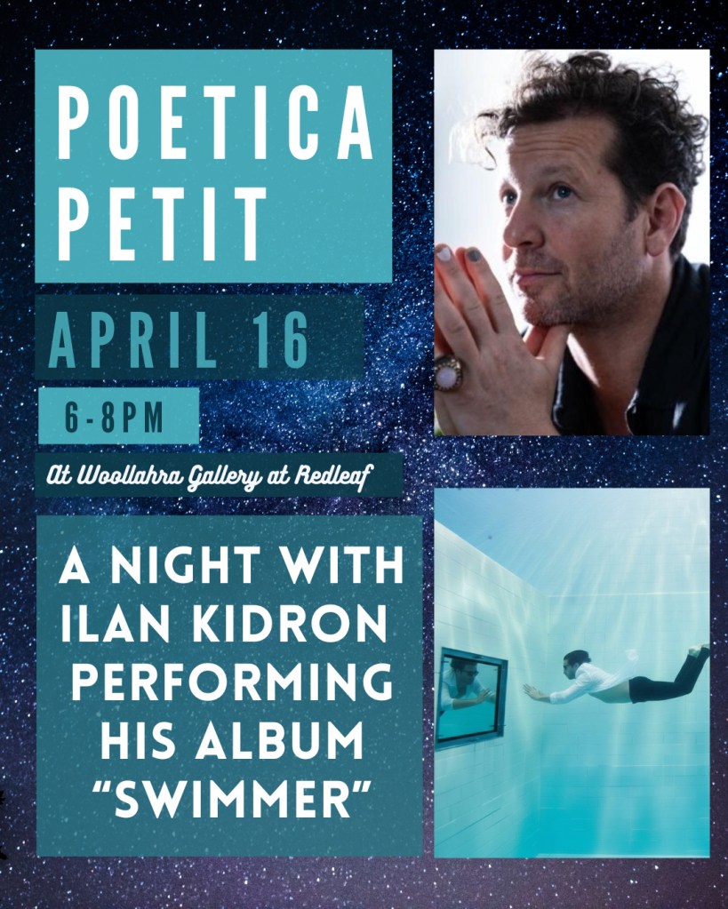 Then on April 16 at Poetica Petit we are thrilled to welcome back Ilan Kidron to share his album “Swimmer” with us. Ilan will feature as musician and poet on this night and will have a chat with Miriam about his process and the album. The theme for the open mic is WATER and you are welcome to try out some lyrics too. Bookings through Woollahra Gallery are here: https://poeticapetit2026.eventbrite.com.au